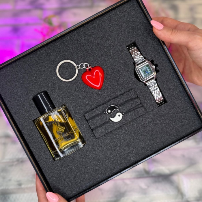 پک ویژه اقتصادی ولنتاین شامل ساعت مچی + ادکلن باکیفیت + دستبند ست یینگ یانگ به همراه جا سوئیچی